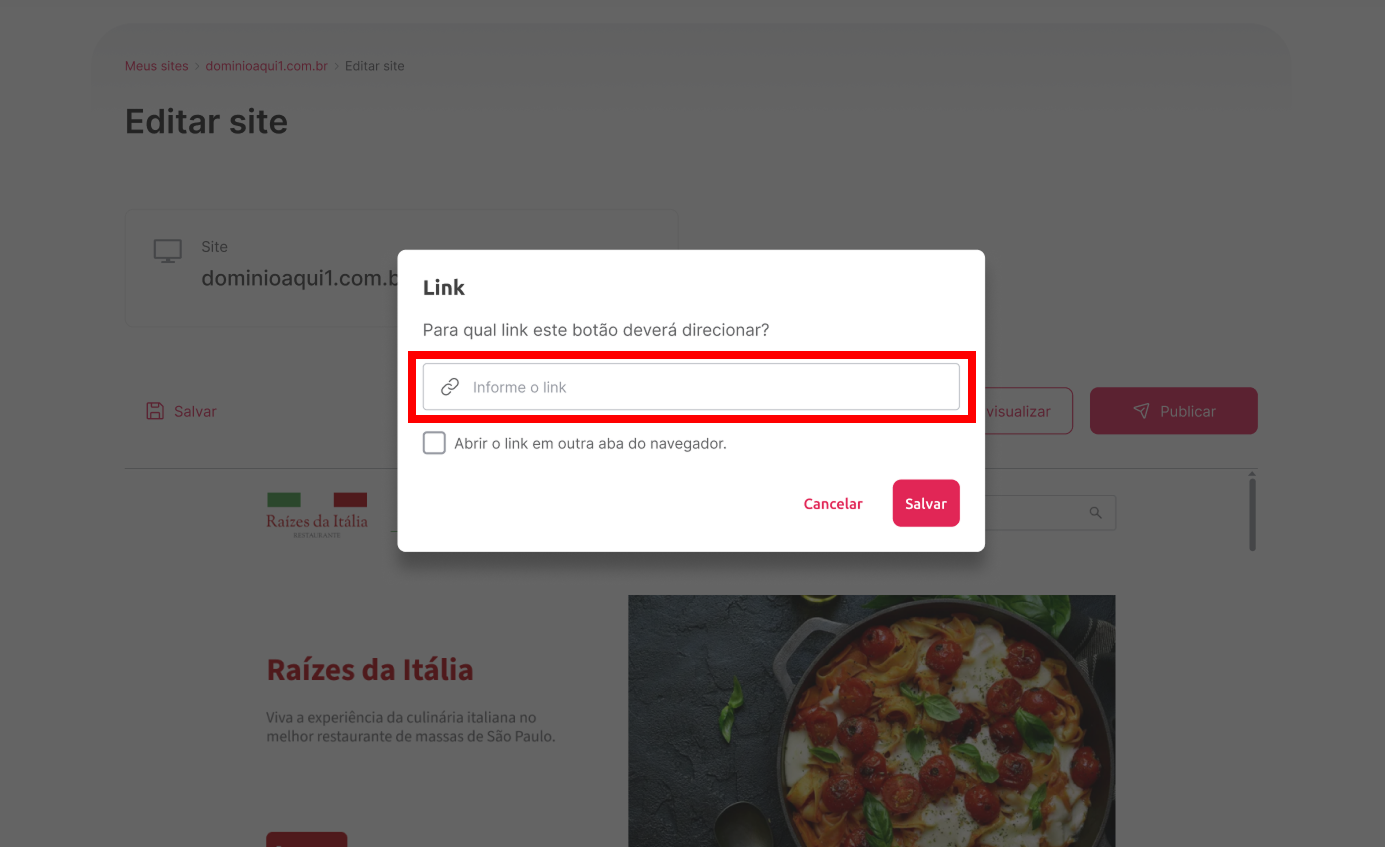 - Uma mensagem aparecerá na sua tela com um campo aberto e o link do botão. Apague o link e insira o novo.