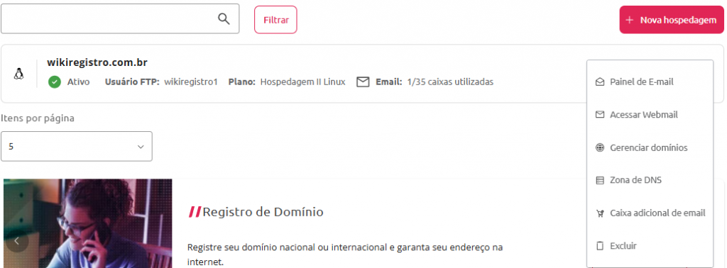 - Na hospedagem já configurada, clique nos três pontinhos, conforme a imagem, e depois na opção Zona de DNS;
