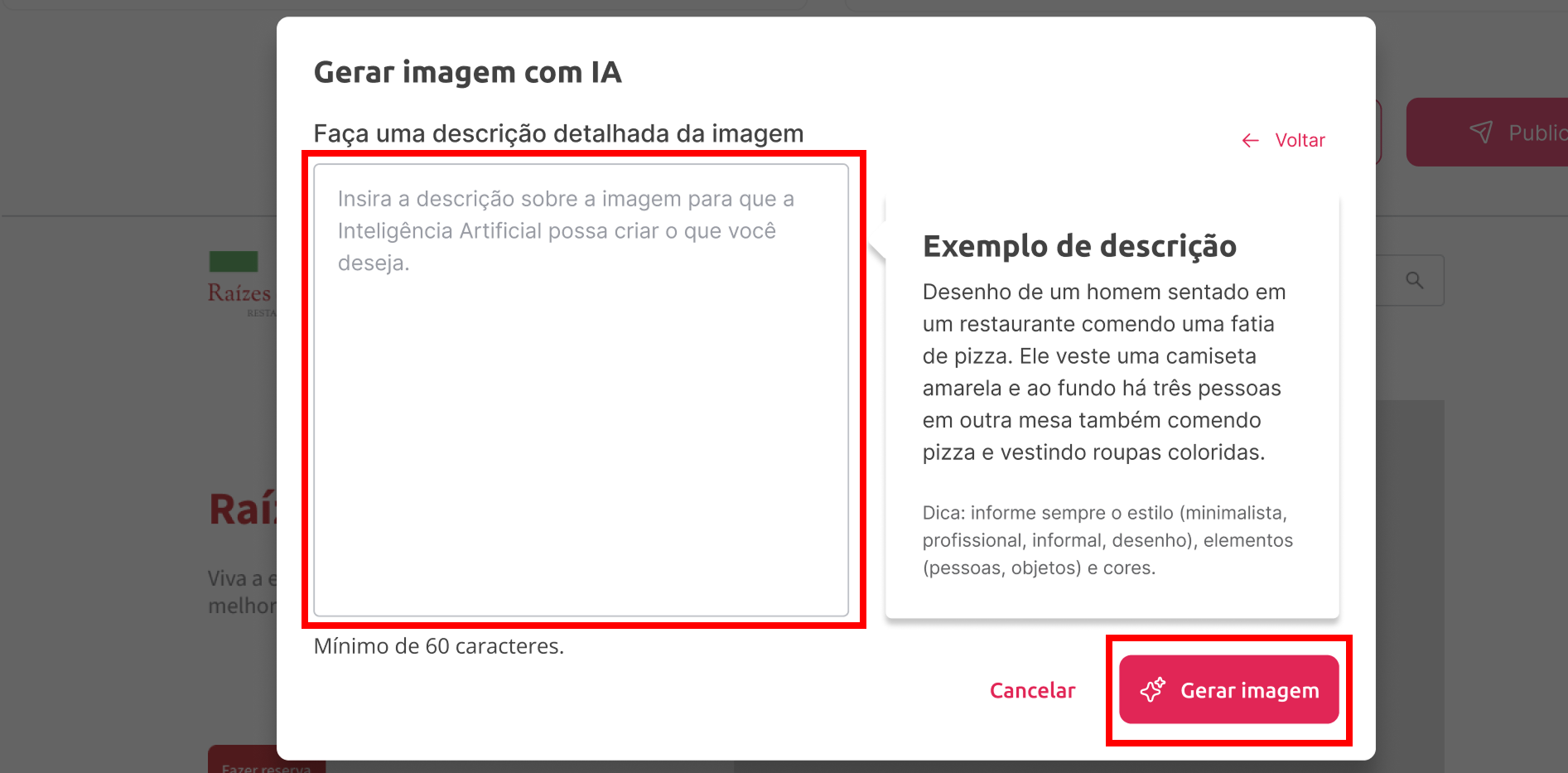 - Selecione o espaço da imagem e clique no botão “Gerar imagem com IA”.