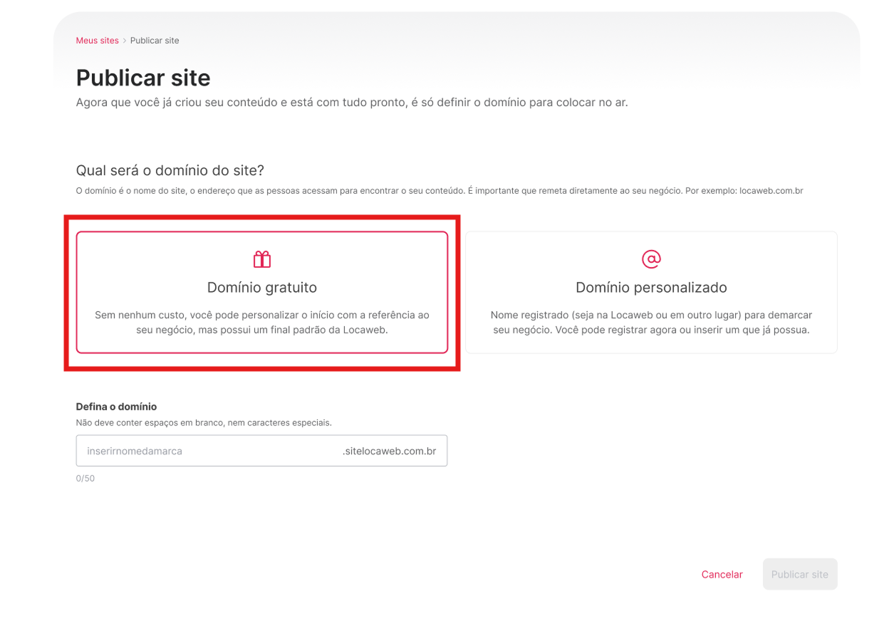 - Você terá duas opções para escolher antes de publicar o site: “domínio gratuito” ou “domínio personalizado”. Clique na primeira opção.