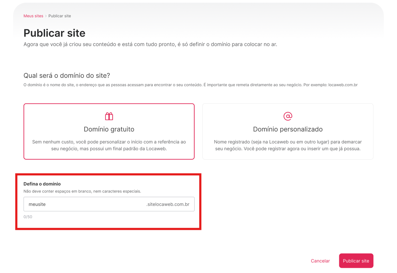 - No campo “defina o domínio”, escreva o nome que você deseja usar.