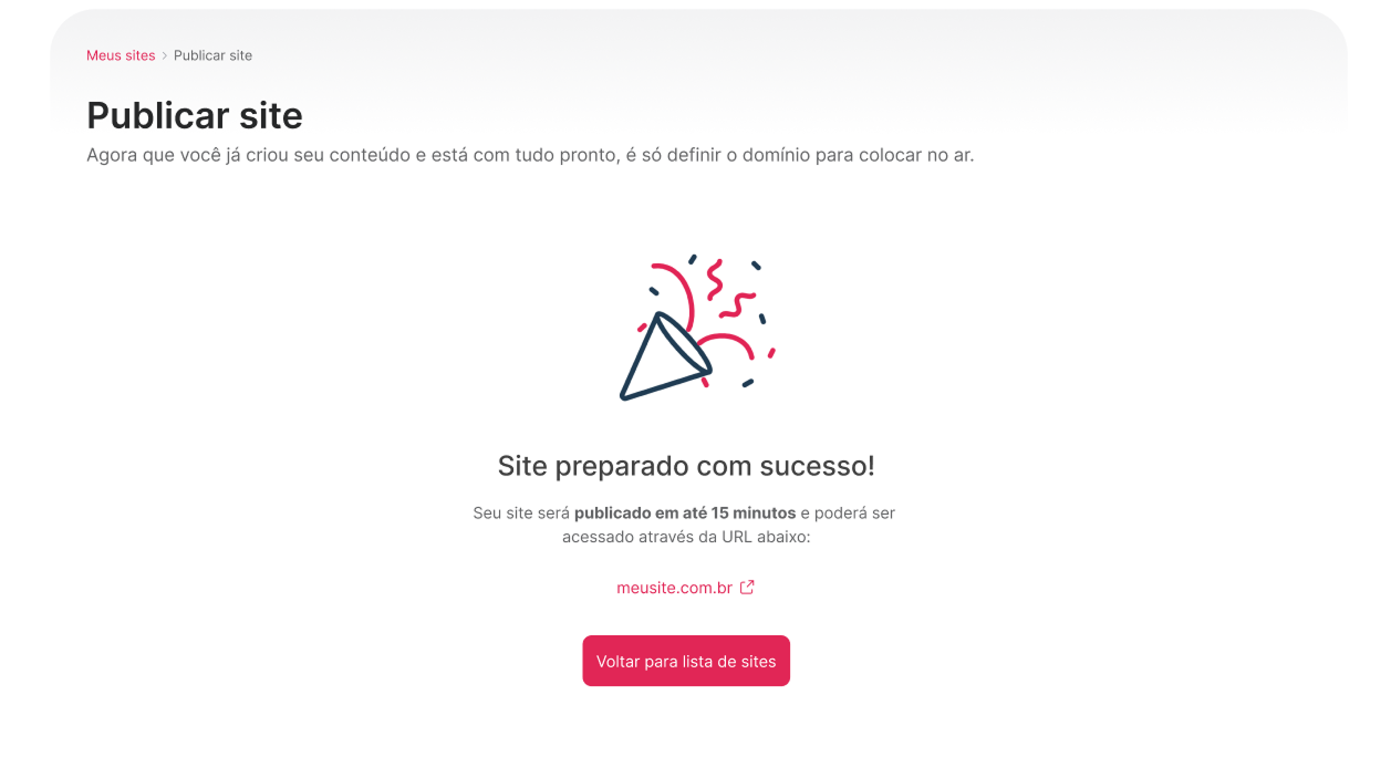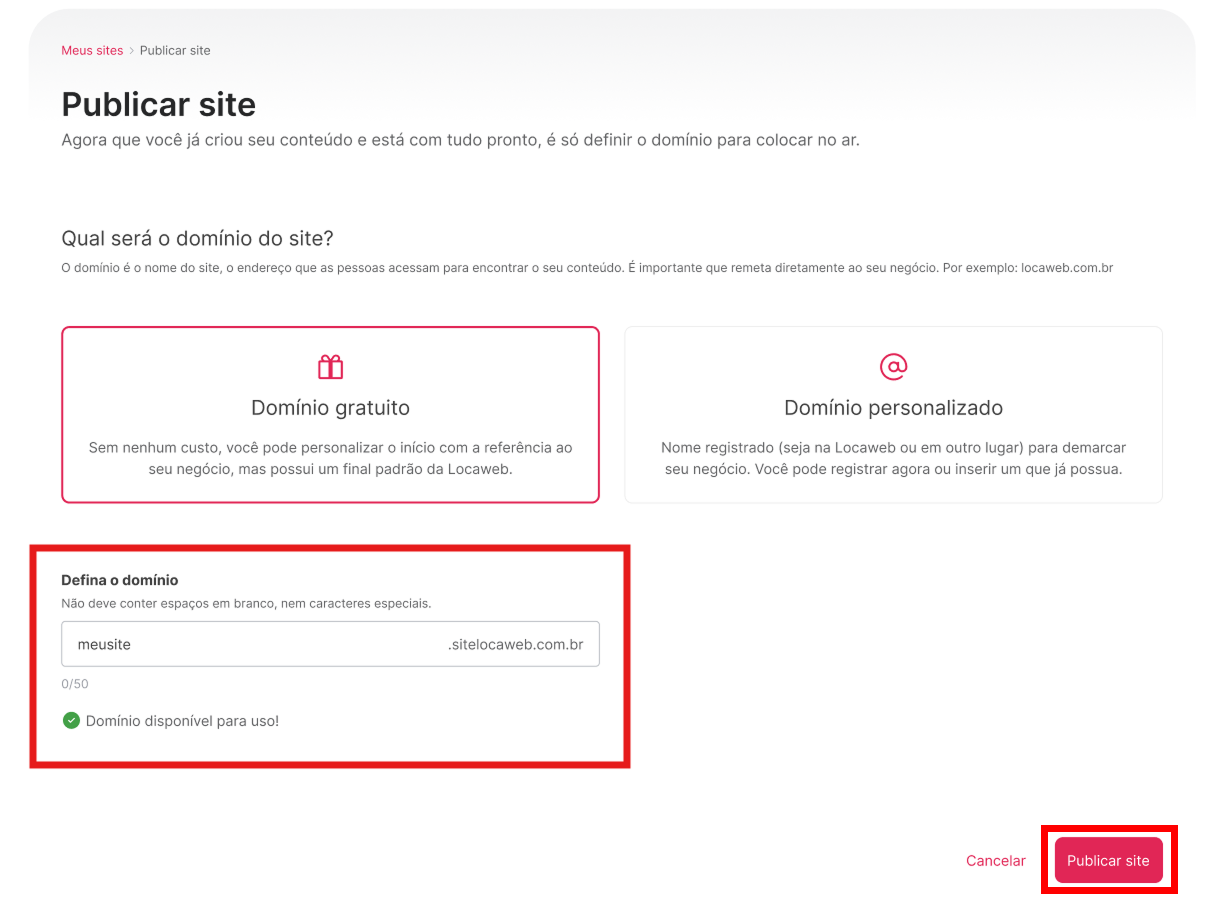 - Se o domínio estiver disponível, uma mensagem de confirmação aparecerá. Basta clicar em “Publicar site” para continuar.