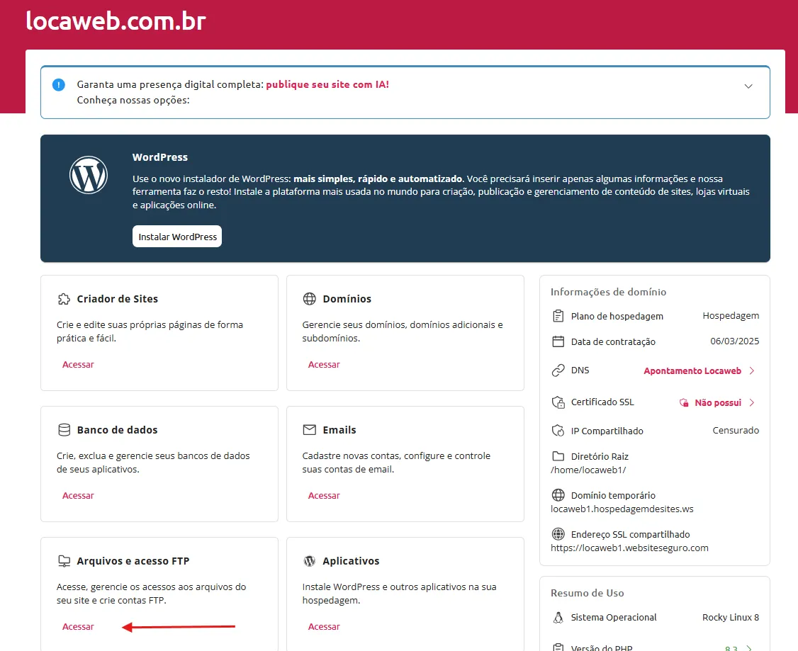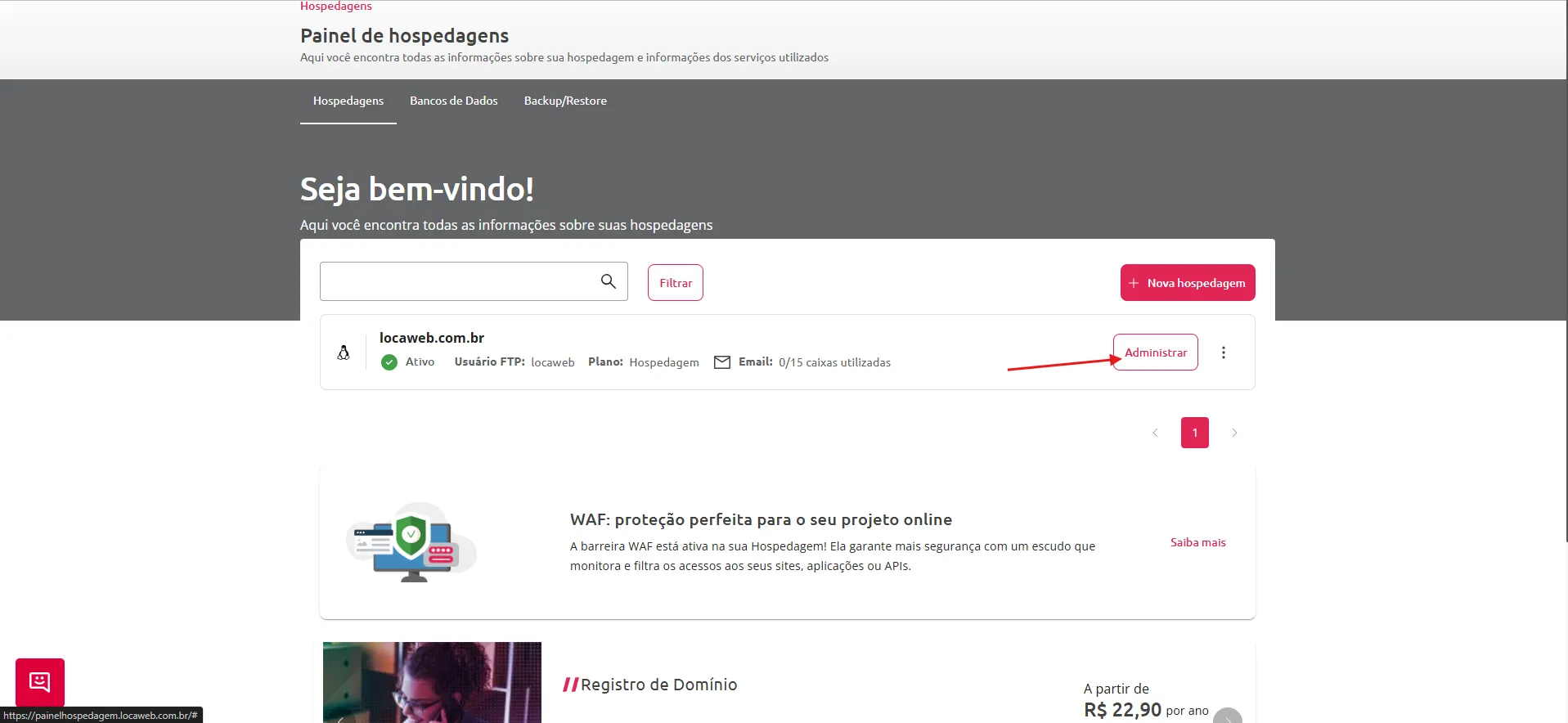 Para acessar o menu “Arquivos e FTP” da sua Hospedagem, acesse seu painel de hospedagem pelo link: https://painelhospedagem.locaweb.com.br/ procure pelo domínio do seu site e clique em “Administrar”, botão que se encontra logo à direita: