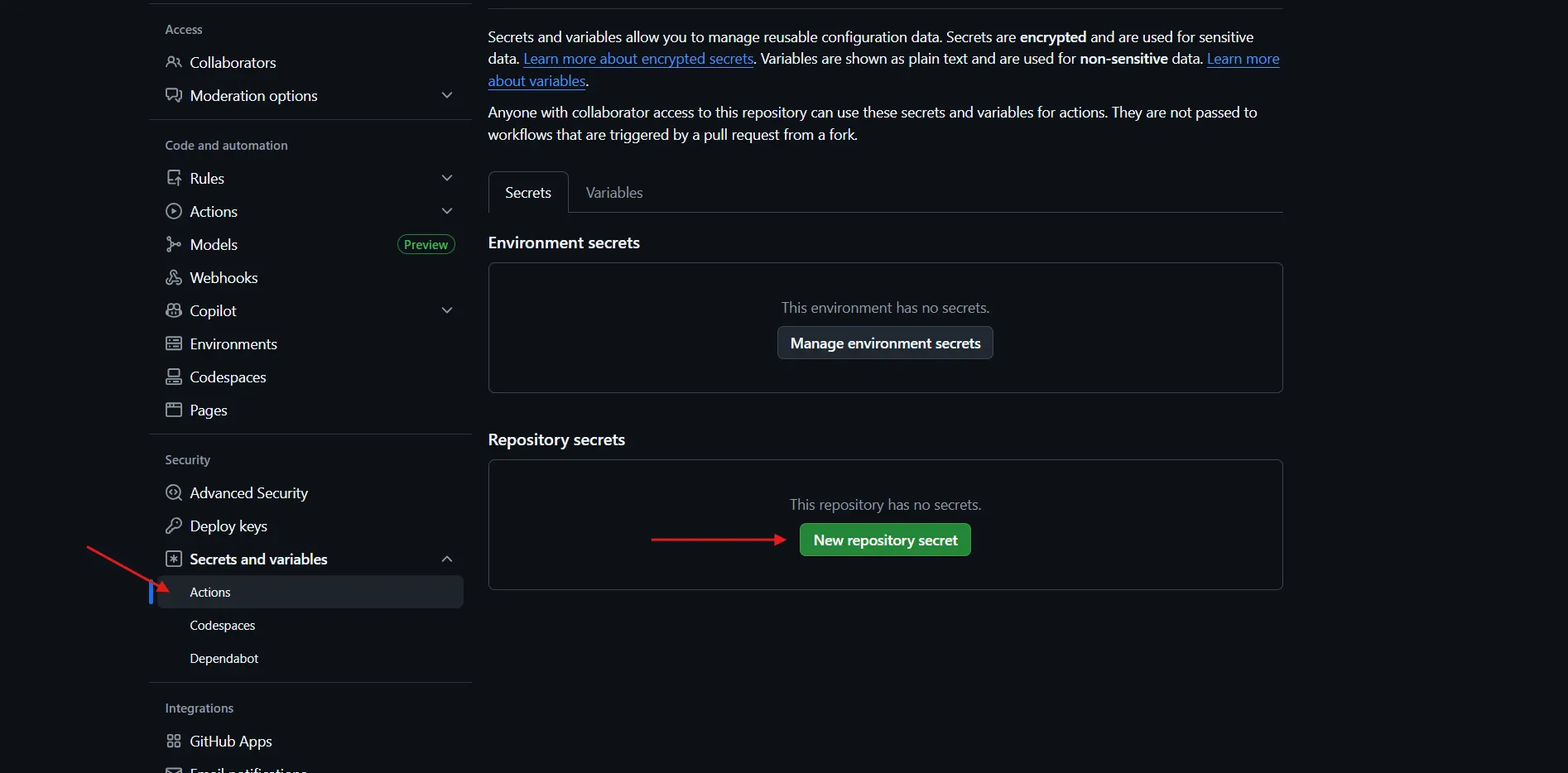 Isso é feito através das secrets (variáveis de ambiente), que se encontra nas configurações do seu repositório: