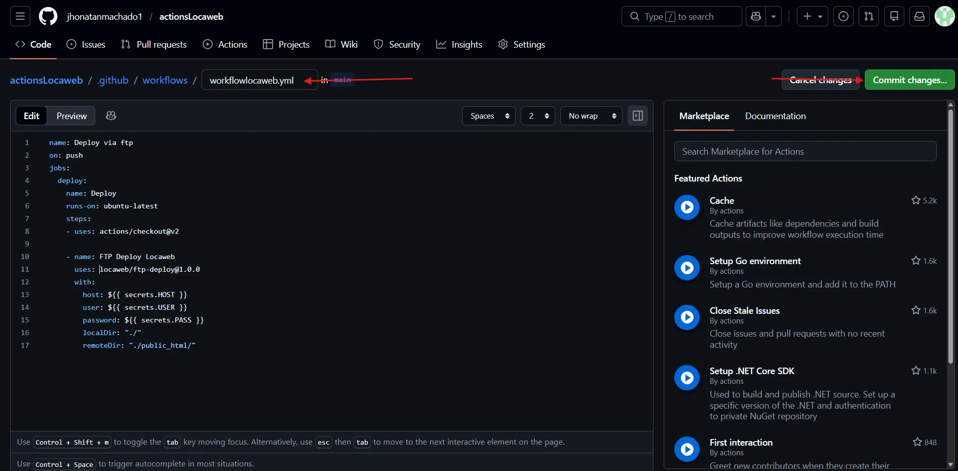 Adicione o código e clique em “Commit changes”. Obs: se quiser nomear o Workflow, você consegue nomeá-lo ali no topo, conforme a setinha do print a seguir, nomeie como preferir, apenas se atente a deixar a extensão .yml no final do arquivo: