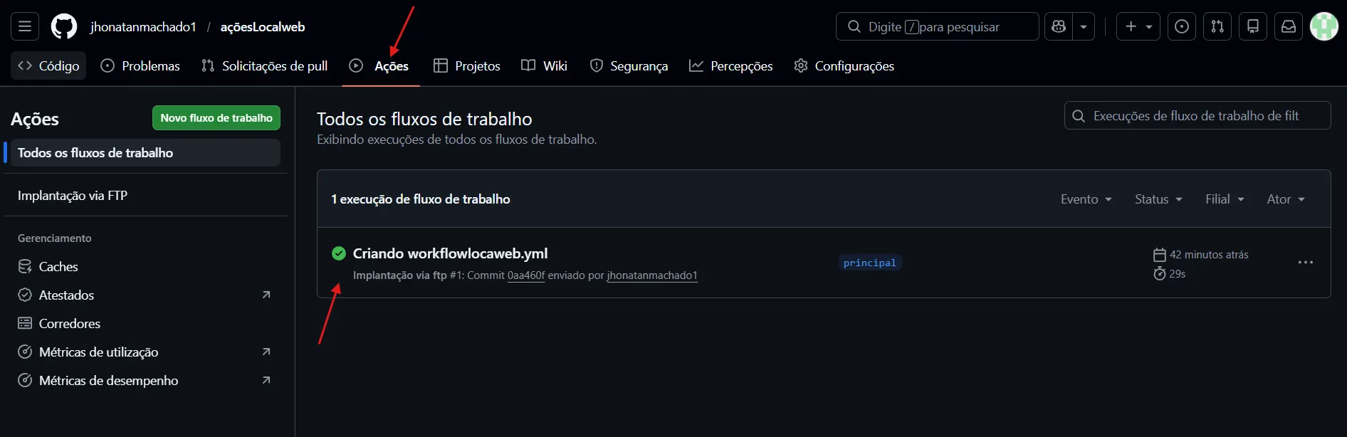 Caso gere algum erro, confirme se as credenciais de acesso ao FTP adicionadas ao secrets estão corretas.