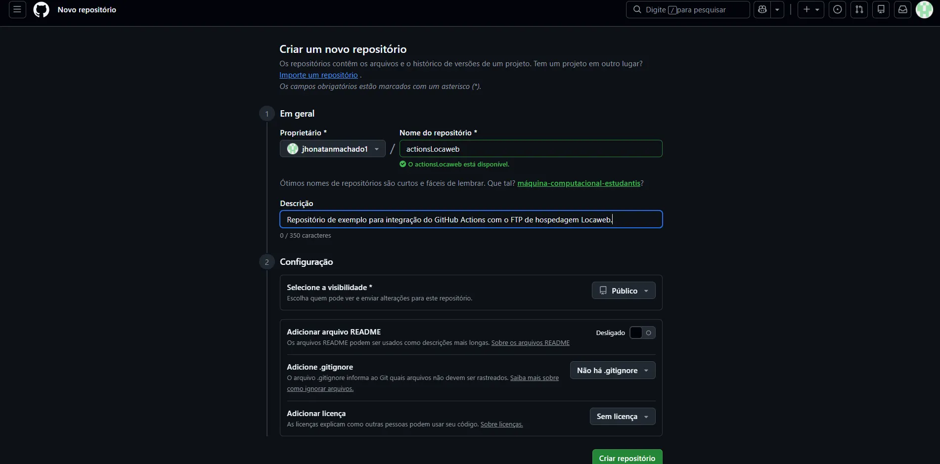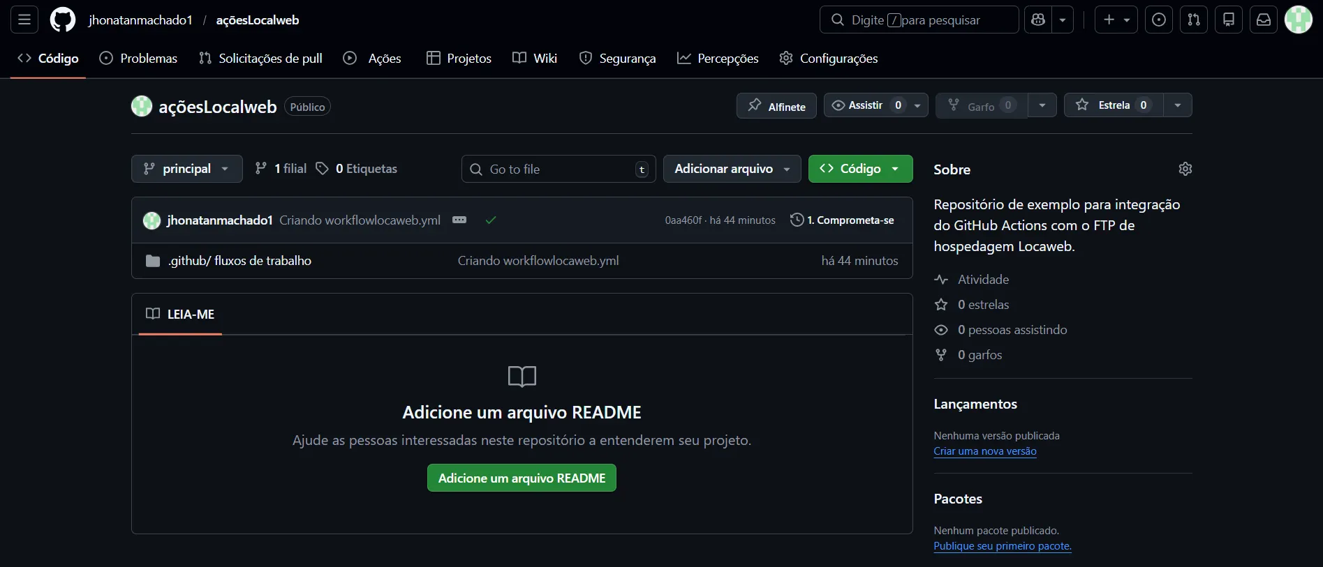 Com o repositório do GitHub em mãos, podemos agora configurar o Workflow e a conexão do Actions com o FTP da sua hospedagem.