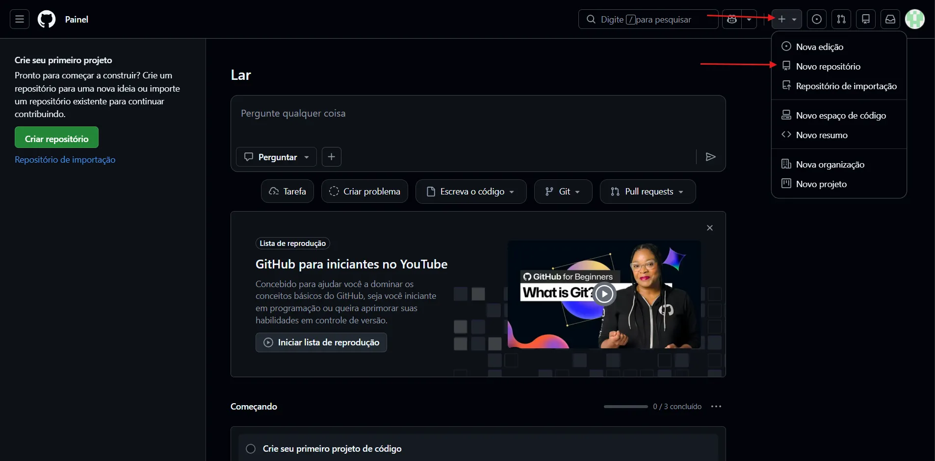 Para criar um novo repositório dentro do GitHub, na página inicial, clicaremos no botão com um sinal de “+” no canto superior direito, e em seguida, clicaremos em “Novo repositório”: