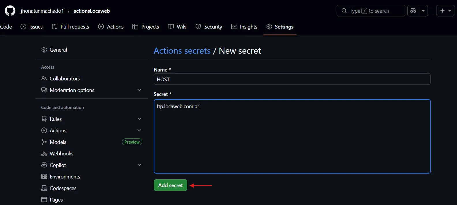 Depois de configurados os três secrets (com as credenciais de acesso FTP corretas), seu repositório está pronto para acessar o FTP via Workflows.