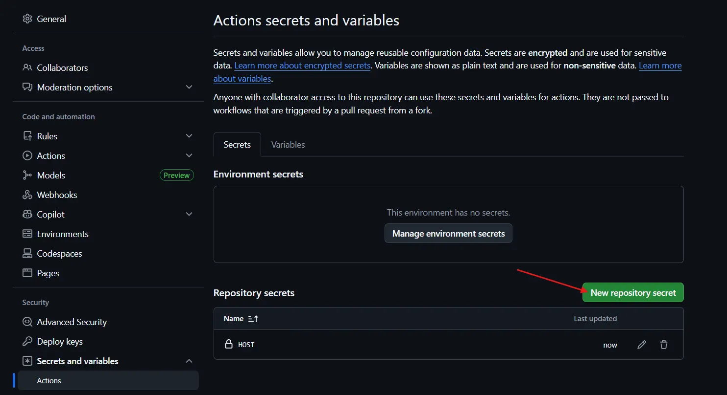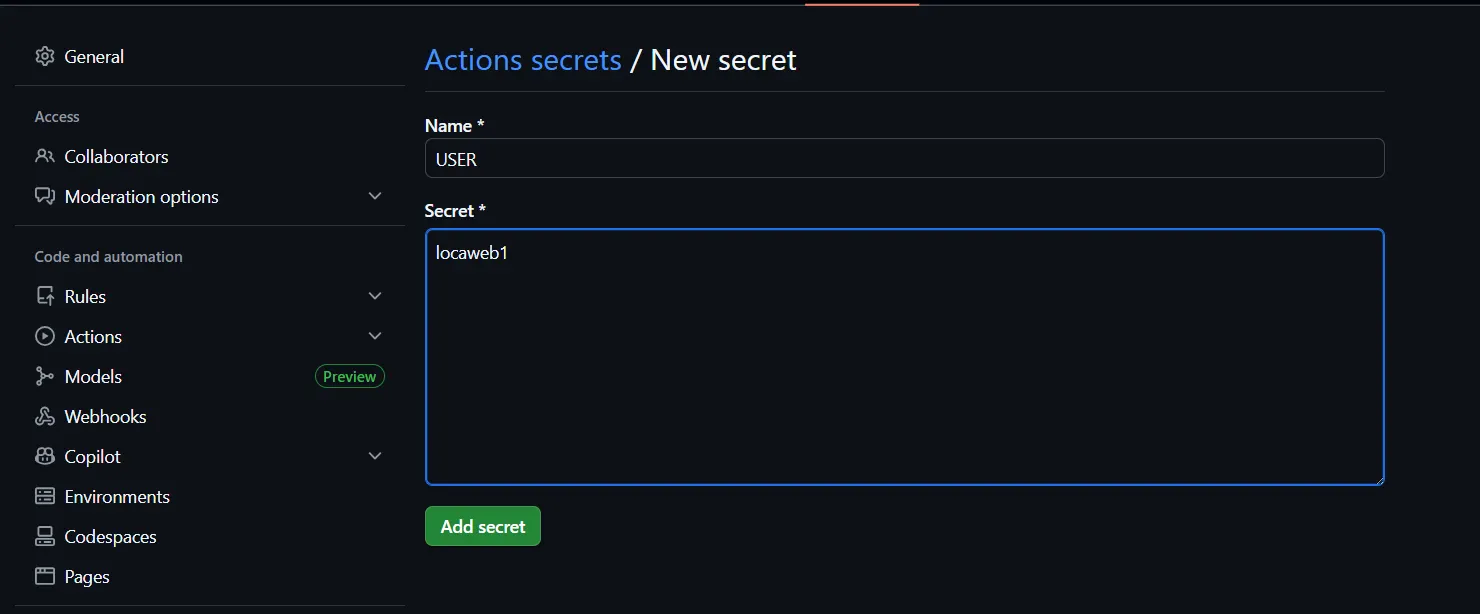 Ao acessar “Secrets and Variables”, configuraremos três credenciais de acesso ao FTP através do “Actions” e em “New repository secrets”: