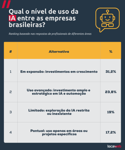 No estudo, baseado nas experiências de pessoas de diferentes áreas (como desenvolvedores, programadores, analistas de dados e gestores de TI), 6 em cada 10 profissionais afirmaram que suas empresas já adotam essas tecnologias de forma estruturada ou estão expandindo seu uso, reforçando a importância da tecnologia no dia a dia corporativo.