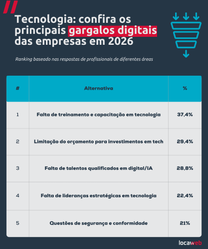Entre os principais desafios, por exemplo, estariam a falta de treinamento e capacitação em tecnologia nas organizações (37,4%), bem como limitações de orçamento para investir em soluções (29,4%), fatores que ainda impedem muitas empresas de acelerar suas jornadas rumo à transformação digital.
