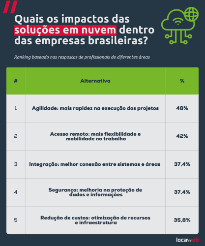 Quando o assunto são os benefícios do cloud no dia a dia, uma parcela considerável dos respondentes apontaram a maior agilidade na execução de projetos e processos (48%), a possibilidade de acesso remoto e maior mobilidade no trabalho (42%) e, ainda, a integração mais eficiente entre sistemas e áreas das empresas (37,4%).