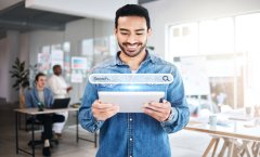 A imagem mostra um homem segurando um tablet. Ele está analisando os produtos que estão em um estoque e, possivelmente, verificando os SKUs de cada um deles para fazer anotações.